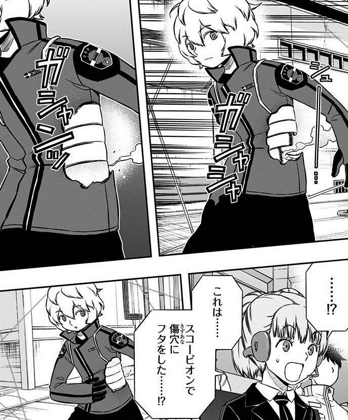 柿崎隊の柿崎隊長をベイルアウトさせた空閑ですが、空閑自身も傷が深くトリオン漏れで脱落しそうです。しかし、空閑はスコーピオンで傷穴にフタをして脱落を阻止します。香取葉子は三雲の気を引くべく、三雲に遠征隊を目指しているか聞きます。