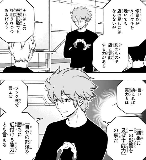 ヒュースは犬飼の狙いを若村に教え、これ以上自分が何か付け足す必要はない、と言いかけますが、若村は納得しません。そこでヒュースは若村の質問に対して、アフトクラトルの師であるヴィザに倣って若村の質問に答える形で答えようとします。まずは若村の質問『実力とは何か』についてヒュースは答え、実力はただの『結果』で深く考える必要はないと言い、タイヤキ職人に例えて『実力とは何か』を具体的に説明します。