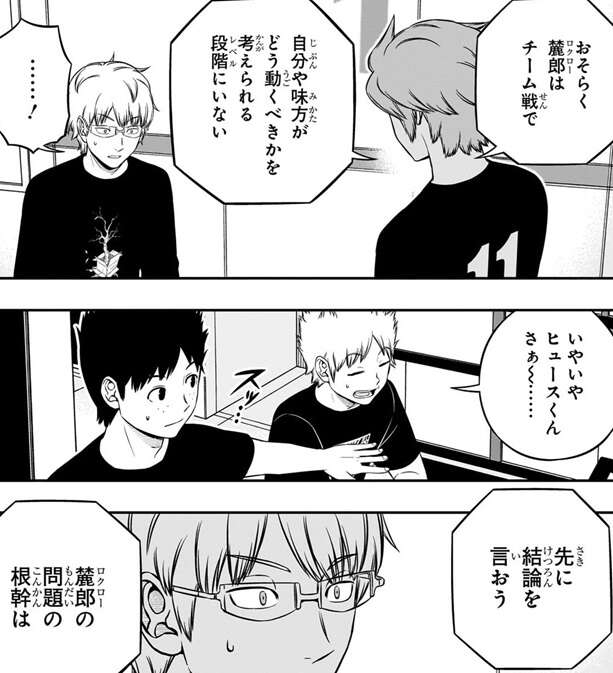 若村の問題の根幹は香取隊にあると指摘したヒュースは、ホワイトボードに若村、三雲、香取のチーム戦での能力のレベルを示していきます。若村とヒュースは話し合い、三雲はA級、香取はB級上位、若村はB級中位のレベル位置を示しますが、ヒュースはこの図には1つ間違いがあると言い、若村の位置をC級まで落とします。さらにヒュースは、若村はチーム戦で自分や味方がどう動くべきかを考えられるレベルにいないと指摘、ヒュースの厳しい指摘を聞いた若村は自信を失い大きなショックを受けます。