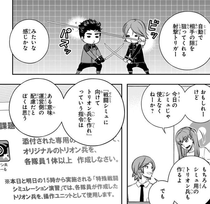 各チームもトリオン兵を作り始めますが、王子2番隊の王子は戦闘シミュ向けのトリオン兵ではなく、肩に『装備』するトリオン兵や背中に装備して空を飛ぶ空中機動用トリオン兵を作成し、ボーダー独自のデザインやアイデアを考えたほうが面白いと言います。
