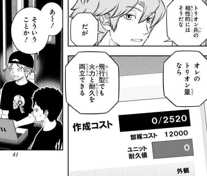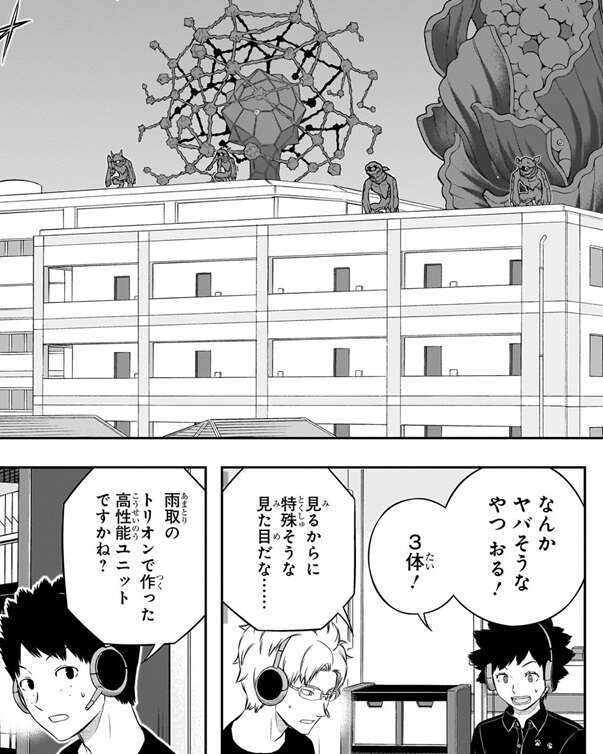 各チームがトリオン兵作りを進める中、若村11番隊のヒュースは飛行型トリオン兵を攻撃に使う作戦を提案します。飛行型トリオン兵なら射程が短いトリオン兵を一方的に倒せるとヒュースは言いますが、飛行型トリオン兵を『攻撃』に使うとコスト的に『守り』は弱くなる、と細井が指摘します。しかし、ヒュースは自分のトリオン量なら飛行型でも火力と耐久を両立できると言い、全員がヒュースの作戦に賛同、採用されることになります。