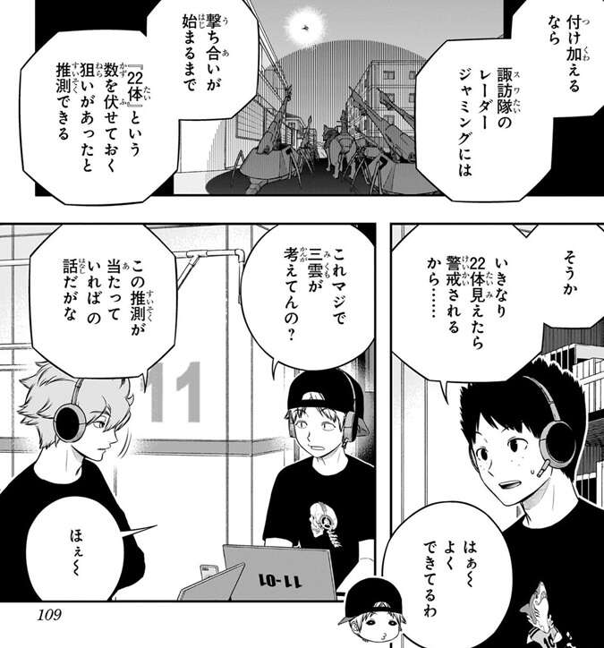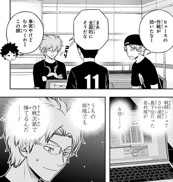 ヒュースは「修が諏訪隊の作戦を立てた」という前提なら、ある程度の推測は可能と言い、諏訪隊の強さの秘密を推測します。それは、諏訪隊の『性能負けしない22体の大群』は、攻撃を2ターンのみに限定することで成立していた、という推測で、諏訪隊の10体いる狙撃型の弾は2ターン分のみにコストを抑えていて、それによって全体のコストを抑えていたというのがヒュースの考えでした。若村隊のメンバーはヒュースの推測を聞いて、三雲が特殊シミュ1日目でアイデアを形にした事に感心します。
