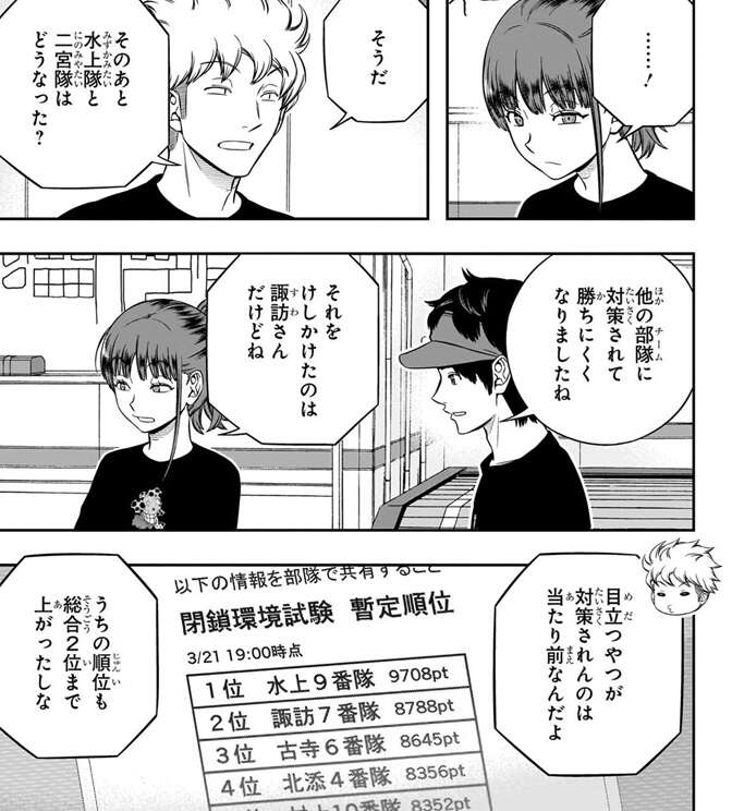 菊地原はうるさい南沢とは相性が最悪で、チームとしてどうなるか心配でしたが意外と何とかなっています。さらに、染井は点をゴリゴリと獲っていき、以外にも菊地原も雰囲気が悪くならない程度の指摘に抑えていて、気が付けば総合順位は4位となっています。このまま長時間戦闘試験に突入して、菊地原のサイドエフェクトが生きる場面があれば一気に上位を追い抜く番狂わせもあるかもしれません。