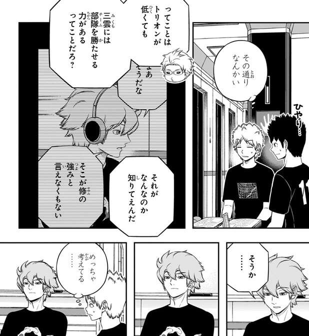 若村は三雲と自分との違いを明らかにすれば、何か自分自身を変える鍵があると考えヒュースに再度、自分と三雲との違いを質問します。ヒュースは、単純にチームとして香取隊より玉狛第二の方が上だったという結論では不満なのか?と、若村に答えますが、若村は三雲が香取隊にいたらもっといい順位を獲っていたような気もすると言い、ヒュースの答えに納得しません。