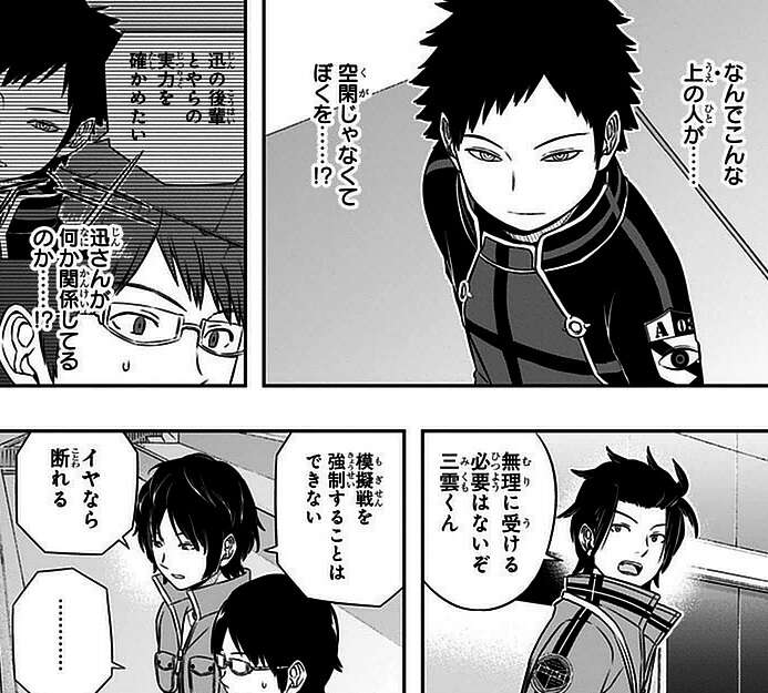 三雲はA級3位部隊の風間から対戦を突然申し込まれ困惑しますが、A級隊員を目指し遠征部隊に選ばれるためには、いつか戦わないといけない相手と覚悟し模擬戦の申し込みを受けます。烏丸からも今のおまえじゃ勝てないぞ、と言われてしまい、実際模擬戦が始まると、あっさりと1敗してしまいます。
