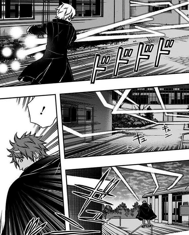 ランバネインの高い火力攻撃に出水、米屋、緑川は分断され、一人ずつ撃破されそうになり、まず緑川が狙われます。しかし、緑川は空閑との個人ランク戦の反省を活かして、ランバネインの片足を削って、ランバネインを追い詰めます。ランバネインも冷静に敵を分析し、今度は飛行しながら反撃を行い始めます。